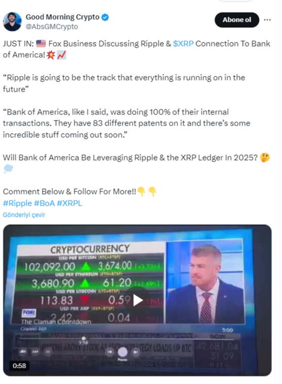 Fox Business, Bank of America ile Ripple ve XRP Bağlantısını Tartışıyor! Ripple gelecekte her şeyin üzerinde koştuğu pist olacak. Bank of America, dediğim gibi, kendi iç işlemlerinin %100’ünü yapıyordu. Bu konuda 83 farklı patentleri var ve yakında inanılmaz şeyler ortaya çıkacak. Bank of America 2025’te Ripple ve XRP Ledger’dan Yararlanacak mı?