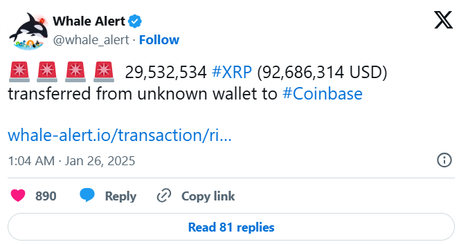Son zamanlarda, kripto topluluğunun dikkatini çeken önemli bir XRP işlemi gerçekleşti. 29 milyon XRP coin, büyük kripto borsası Coinbase’e transfer edildi. Whale Alert’a göre, 29.532.534 XRP, yaklaşık 92.7 milyon dolar değerinde, bilinmeyen bir cüzdandan Coinbase’e gönderildi. Borsalara yapılan büyük transferler genellikle potansiyel satış faaliyetleriyle ilişkilendirilse de, bu özel hareketin nedeni belirsizliğini koruyor ve başka faktörler de devrede olabilir.