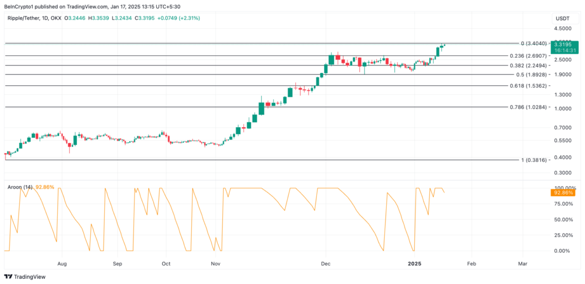 XRP’nin Aroon göstergesi, mevcut yukarı yönlü trendin güçlü olduğunu doğruluyor. Bu indikatör, fiyat hareketlerinin ne kadar güçlü olduğunu ölçerek yukarı yönlü trendlerin sürdürülebilirliğini analiz eder. XRP’nin Aroon Up Line değeri şu anda %92,86 seviyesinde ve bu, varlığın güçlü bir yükseliş trendinde olduğunu işaret ediyor. Eğer bu ivme devam ederse, XRP’nin fiyatının yeni zirveler görmesi mümkün.