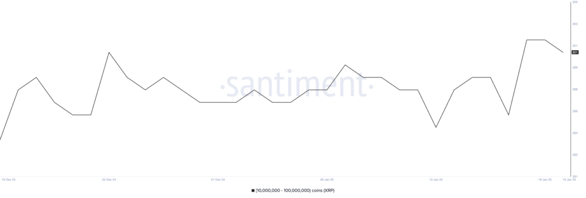 XRP balina adreslerinin sayısı 17 Ocak’ta 302’ye ulaşarak tarihinin en yüksek seviyelerinden birine ulaştı. Bu rakam, daha sonra 301’e gerilese de yüksek seviyelerde kalmayı başardı. Bu durum, büyük yatırımcıların gelecekteki fiyat artışlarına olan beklentilerini ve güvenlerini yansıtıyor.
