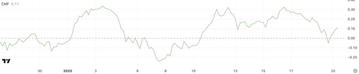 CMF, bir varlığa olan para akışını analiz eder. Pozitif değerler, alım baskısını ve birikimi işaret ederken, negatif değerler dağıtımı ve satış baskısını yansıtır. Şu anki 0.11 seviyesi, alıcıların hâlâ piyasaya hakim olduğunu ortaya koyuyor. Ayrıca, orta düzeyde bir birikimin devam ettiğini gösteriyor.