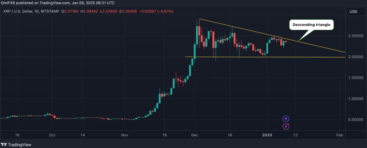 XRP fiyatı, Aralık ayı başında 2,9 dolar civarındaki zirvesinden bu yana bir “alçalan üçgen” formasyonu oluşturdu. Teknik analize göre, bu formasyondan yükseliş yönünde bir kırılma %40 ya da daha fazla fiyat artışına yol açarak, XRP’nin 50 sente yaklaştığı Kasım ayı başındaki yükseliş trendini devam ettirebilir. İşte analist Omkar Godbole ve Shaurya Malwa’ya göre XRP fiyatındaki değişim beklentileri…