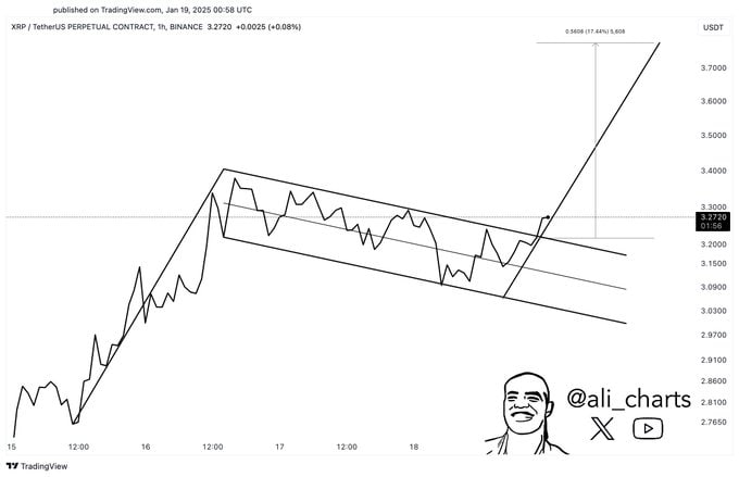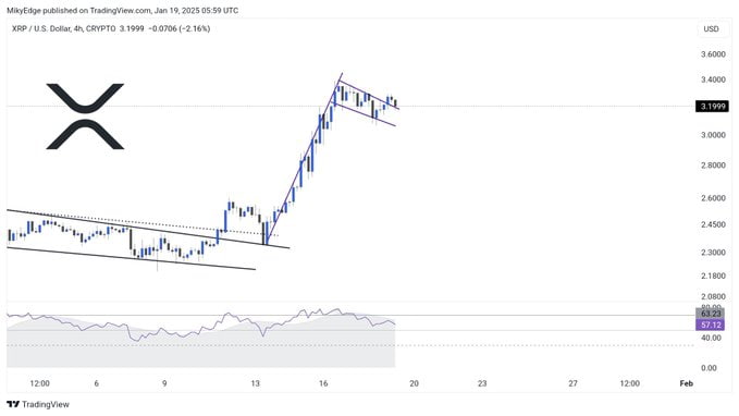 Bir diğer analist MikybullCrypto, XRP’nin “devasa bir harekete” hazırlandığını ifade etti. 4 saatlik grafikte görülen boğa bayrağı formasyonu, yukarı yönlü güçlü bir trendin habercisi olabilir. Bu formasyon, keskin bir yükselişin ardından sıkı bir konsolidasyon döneminden sonra yeni bir sıçramaya işaret eder.