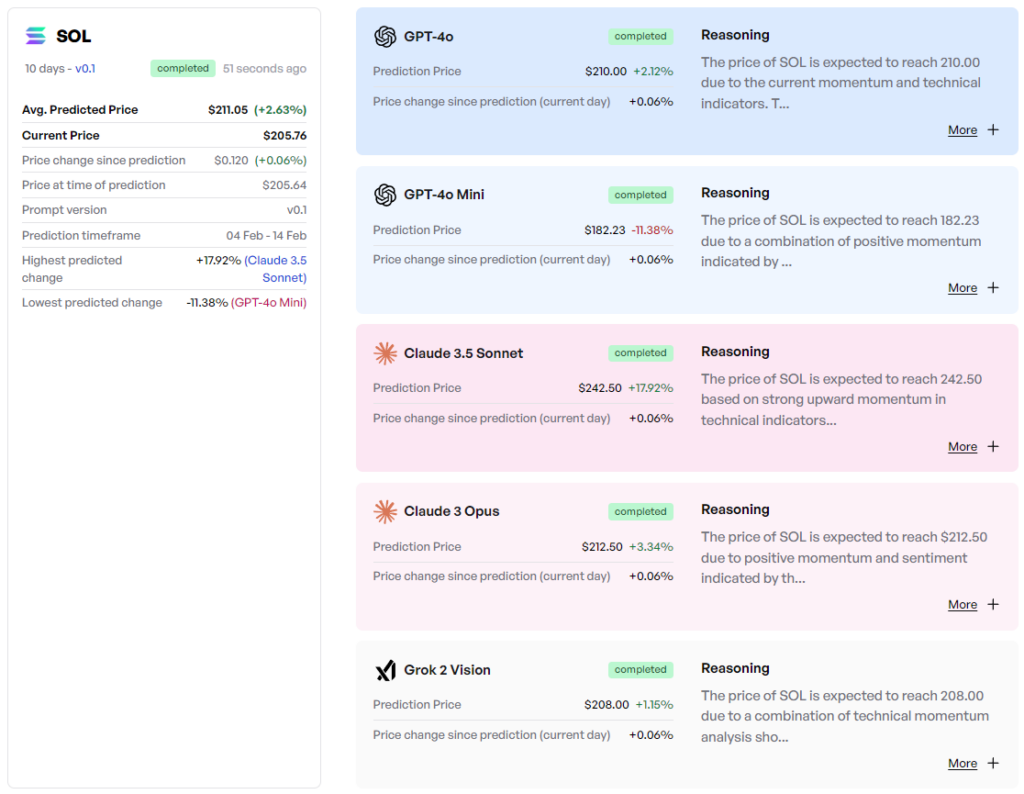 Yapay zeka SOL Coin fiyat tahmini.Şubat ayının yarısına gelindiğinde, yapay zeka SOL coin fiyatının 200 doların üzerinde kalacağını tahmin ediyor. Beş yapay zeka modeli ortalama 211,05 dolarlık bir fiyat öneriyor. Bu da mevcut fiyata göre SOL’un yatay bir seyir izleyeceği anlamına geliyor. Claude 3.5 Sonnet, SOL’u 242,50 dolar olarak belirleyerek %15 ile en yüksek tahmini sundu. Opus ise %3,34’lük önerilen fiyat değişikliği ile daha az iyimser oldu. Bununla birlikte, GPT-4o mini düşüş öngören tek yapay zeka modeli oldu.