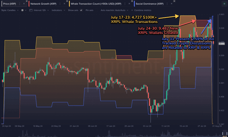 Temmuz ayında XRP fiyatı, ağ büyümesi ve balina işlemleri. Kaynak: Santiment