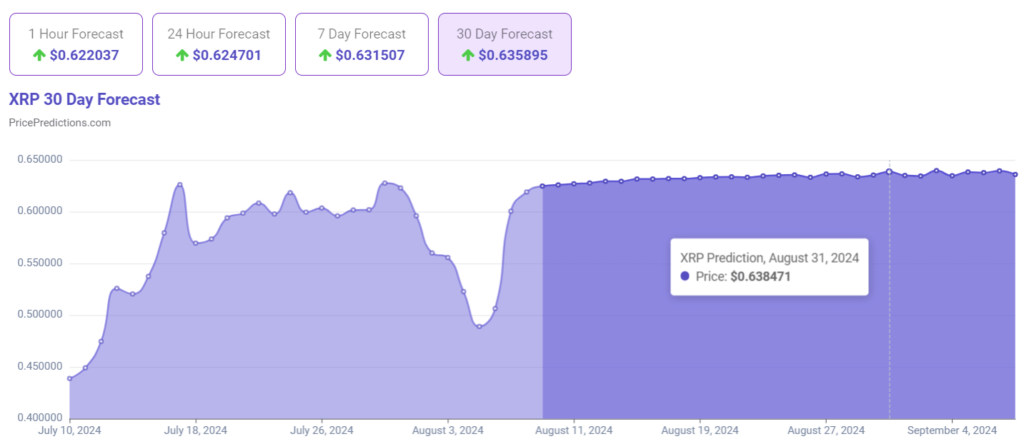 Bu bağlamda, kripto piyasası analiz ve tahmin platformu PricePredictions tarafından kullanılan gelişmiş yapay zeka (AI) ve makine öğrenimi algoritmaları, bu ayın sonuna doğru XRP Coin için mütevazı da olsa daha fazla ilerleme öngörüyor. Özellikle, Bollinger Bantları (BB), ortalama gerçek aralık (ATR), hareketli ortalama yakınsama sapması (MACD), göreceli güç endeksi (RSI) ve diğerleri gibi teknik analiz (TA) göstergelerine dayanan algoritma, XRP Coin fiyatının 31 Ağustos 2024’e kadar 0,638471 dolar fiyatına ulaşacağını öngörüyor. Bu da mevcut 0,59 dolarlık XRP Coin fiyatından yaklaşık 9’luk bir artış anlamına geliyor.