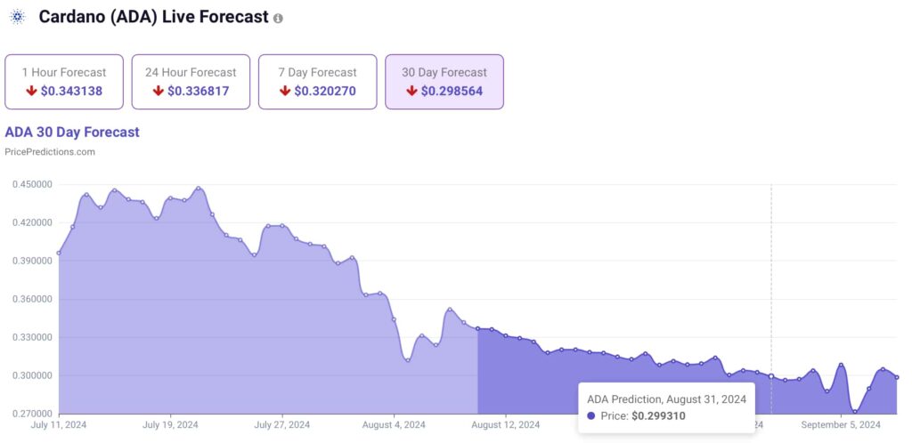 DeFi token, 24 saatlik kazancına rağmen, genellikle uzun vadeli piyasa eğilimlerinin bir göstergesi olarak görülen ve mevcut konumunda hakim bir düşüş eğilimine işaret eden önemli bir gösterge olan 200 günlük basit hareketli ortalamasının (SMA) altında işlem görüyor. Daha da kötüsü, son 30 günde Cardano yalnızca 13 yeşil gün veya zamanın %43’ünü kaydetti. Ayrıca, geçtiğimiz yıl en büyük 100 kripto varlığının 65’inden daha düşük performans gösterdi. PricePredictions’ın yapay zeka analizi, Ağustos 2024’ün sonunda Cardano’nun fiyatının 0,299 dolar civarına düşeceğini gösteriyor. Bu da mevcut fiyatından yaklaşık %12’lik bir düşüşü temsil ediyor.