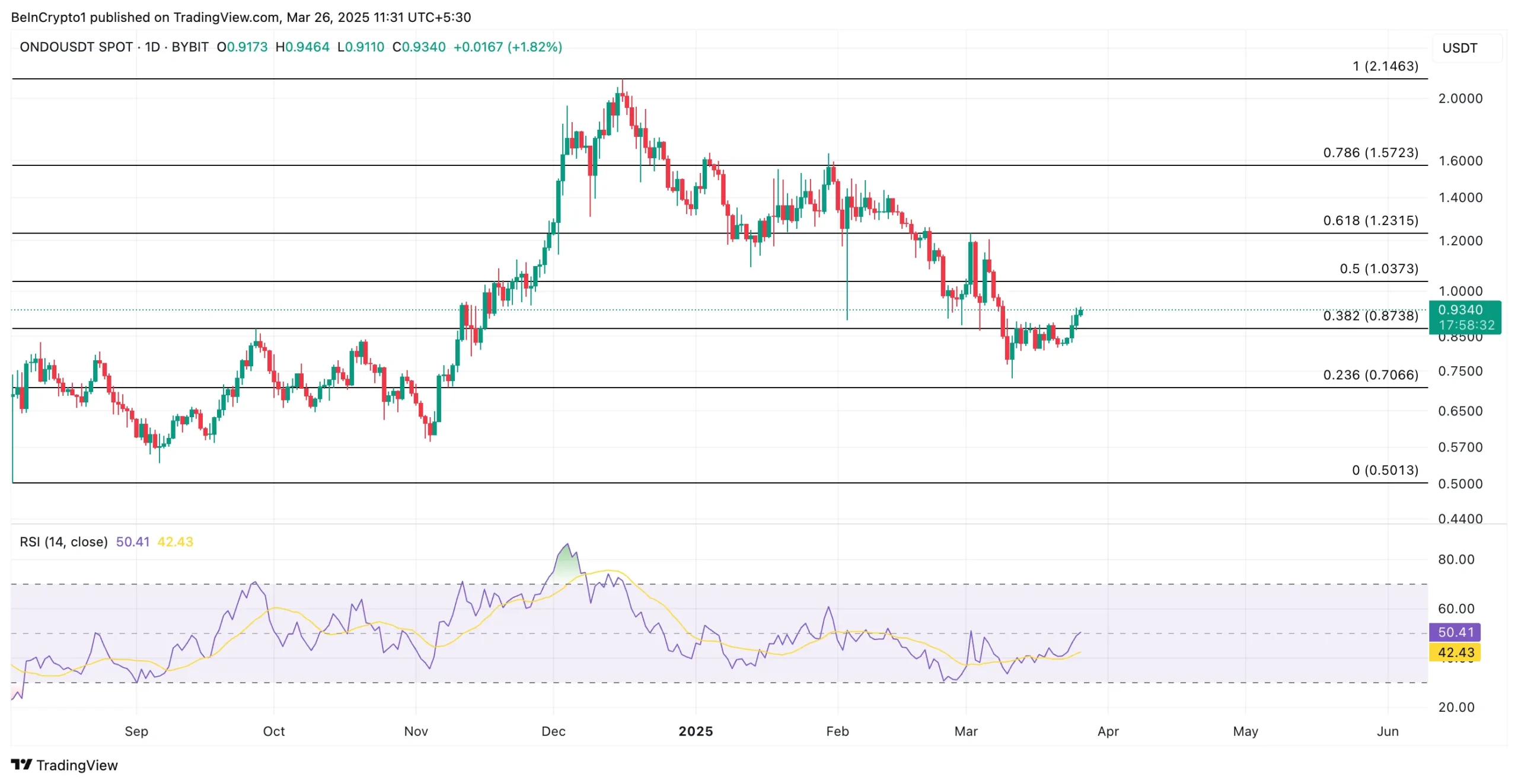 ONDO, günümüzde en çok aranan altcoinlerden biri. Yazı sırasında, son 24 saat içinde %6’lık bir fiyat artışı kaydederek 0,93 dolardan el değiştiriyor. Yükselen Göreceli Güç Endeksi (RSI), ONDO’nun piyasa katılımcıları arasında artan alım baskısını doğruluyor. Temel momentum göstergesi basın zamanında yükseliş trendinde ve 50-nötr çizgisinin üzerine çıktı.