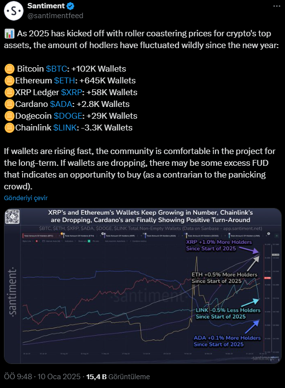 Bitcoin (BTC) fiyatı 100.000 dolar fiyat sınırının altında dalgalanmaya devam ederken, Ethereum (ETH), Dogecoin (DOGE), Cardano (ADA) ve XRP gibi altcoinler de gündemde. Santiment’in verilerine göre, bu altcoinler için HODLers sayısı bu yeni yılda şu ana kadar dalgalandı. Kripto analiz platformu, HODLer sayısının her bir protokolün ekosistemi içindeki etkisine işaret etti.