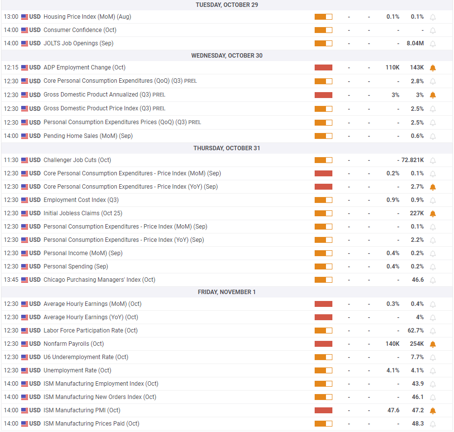 ABD Ekonomik Analiz Bürosu (BEA) Çarşamba günü üçüncü çeyreğe ilişkin yıllıklandırılmış Gayri Safi Yurtiçi Hasıla (GSYH) büyümesinin ilk tahminini yayınlayacak. Yatırımcılar, ABD GSYH’sinin ikinci çeyrekte kaydedilen büyümeye paralel olarak %3 oranında artacağını tahmin ediyor. Piyasa beklentisinin üzerinde bir veri, ilk tepki olarak muhtemelen doları artıracaktır. Böylece, altın fiyatlarının daha fazla gerilmesine neden olması mümkün. Öte yandan, %1 ila %2 arasında hayal kırıklığı yaratan bir GSYH rakamı dolara zarar verecektir.