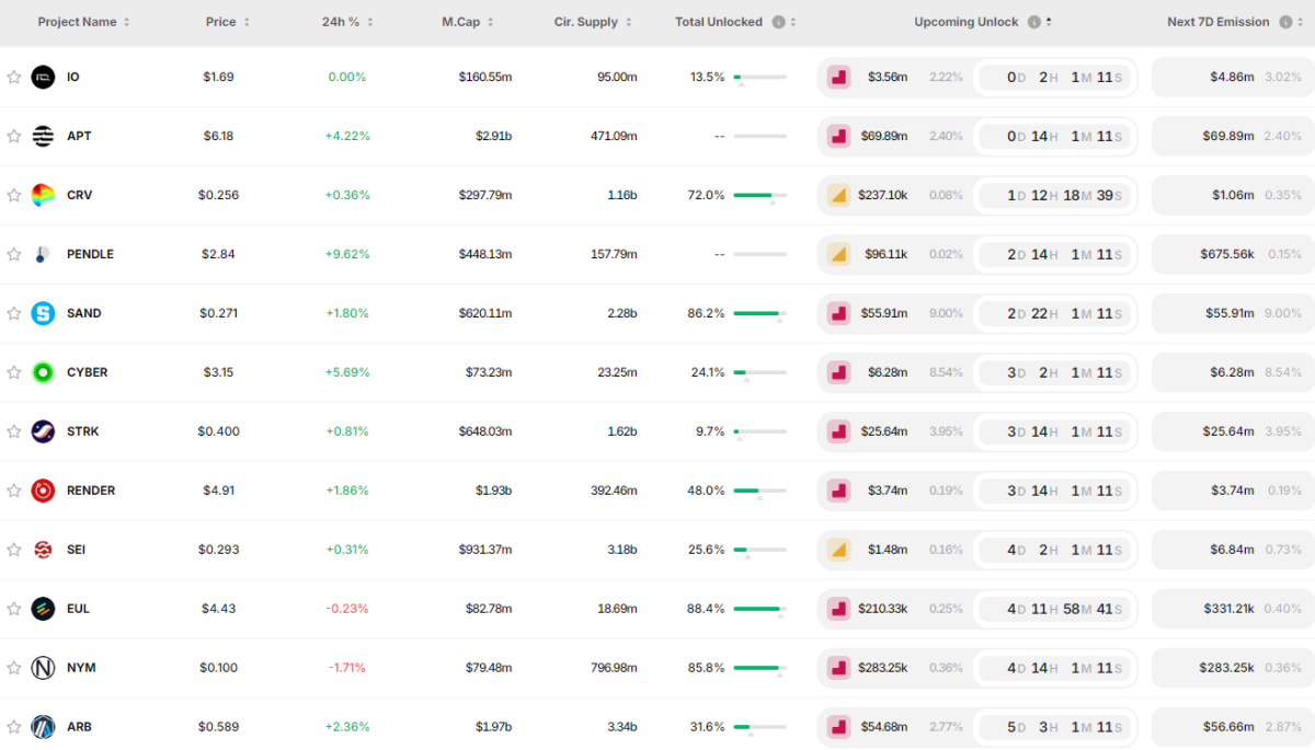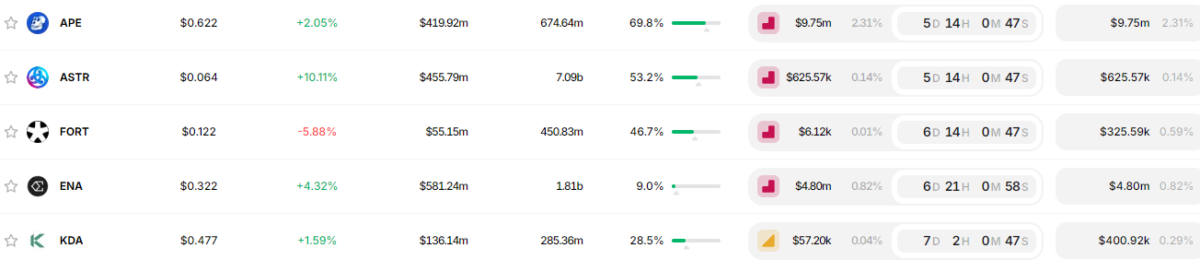 Aptos (APT) ise 12 Ağustos’ta 11.31 milyon dolar değerinde tokenın kilidini açacak. Bu işlem, arzı %2.4 oranında artıracak. Aptos’un düzenli olarak gerçekleştirdiği bu token kilidi açma işlemleri, yüksek enflasyon oranlarına katkıda bulunuyor. Arbitrum (ARB), 16 Ağustos’ta 53.05 milyon dolar değerinde tokenın kilidini açacak. Bu, aylık enflasyon oranının %2.8’e ulaşmasına neden olacak. Son aylarda ARB tokeninin değerinde yaşanan düşüş, yatırımcıları endişelendiriyor. Önümüzdeki haftalarda gerçekleşecek bu büyük token kilidi açma işlemlerinin piyasa volatilitesini artıracağı ve özellikle APT, SAND ve ARB fiyatlarında düşüş yaşanabileceği öngörülüyor. Hafta boyu kilit açacak diğer kripto paralar ise şu şekilde: