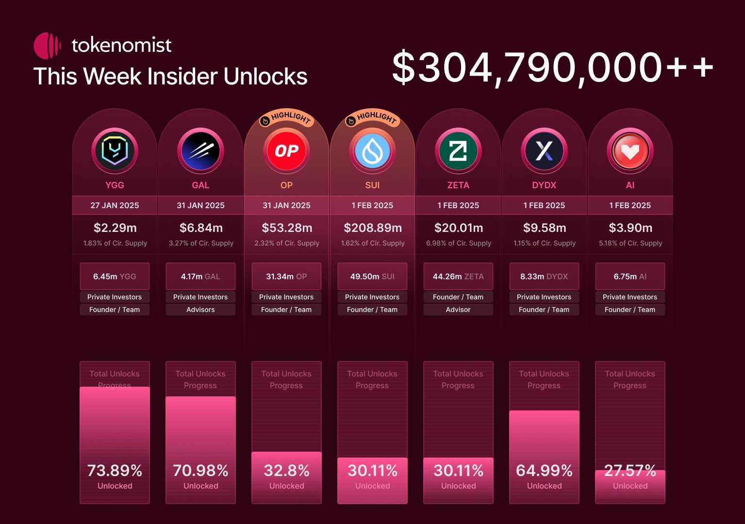 27 Ocak – 2 Şubat 2025 tarihleri arasında, birçok büyük token ciddi miktarda insider token kilidinin açılmasıyla gündeme gelecek. Toplamda 304,8 milyon token piyasaya sürülecek ve bu durum fiyatları potansiyel olarak etkileyebilir. SUI coin, OP, ZETA, DYDX, GAL, AI ve YGG, yakında kilidi açılacak en dikkat çekici tokenlar arasında yer alıyor. Bu “unlock”lar, özellikle SUI, OP ve ZETA gibi tokenlar için piyasanın genel olarak düşüş eğilimi gösterdiği bir döneme denk geliyor.