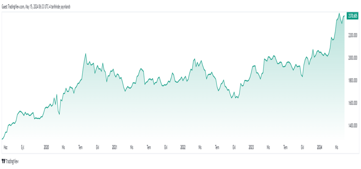 Kriptokoin.com’dan takip ettiğiniz üzere dünyanın en büyük emtiası istikrarlı ve parlak bir büyüme kaydetti. Parlak metal son 5 yılda %80,48, son 52 haftada %16,67 artış gördü. Ayrıca, 2024’ün başından bu yana %13,72 değer kazandı. Bu yükseliş, altın fiyatının bugün 2.370 dolar seviyesine ulaşmasına yol açtı.