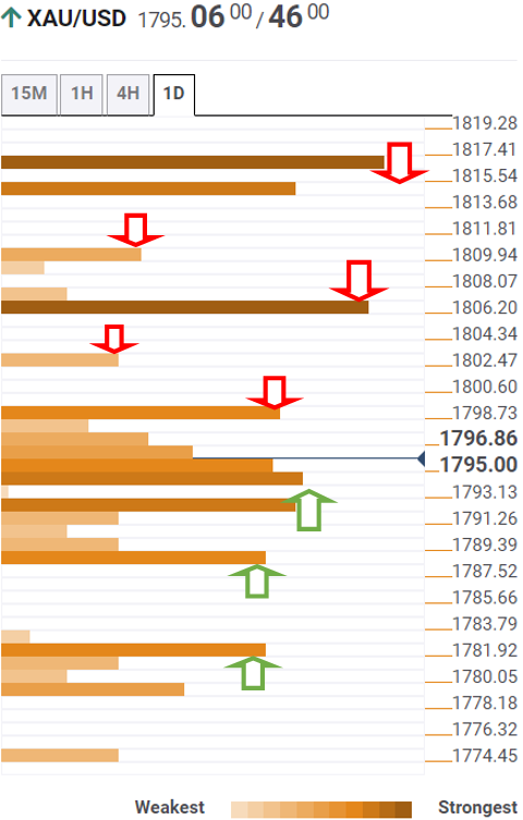 Dört saatlik SMA200 ve bir günlük R1 pivot noktasının 1.809 dolar birleşmesi, düşüş taahhütlerine meydan okuyacak. Altın boğaları için bir sonraki durak, önceki haftanın yükseği, önceki ayın yükseği ve bir aylık R1 pivot noktasının birleştiği 1.816 dolar civarında görülüyor. Flip tarafında, ani düşüş, 1.795 dolar civarında yoğun bir sağlıklı destek seviyeleri kümesi tarafından korunuyor gibi görünüyor.